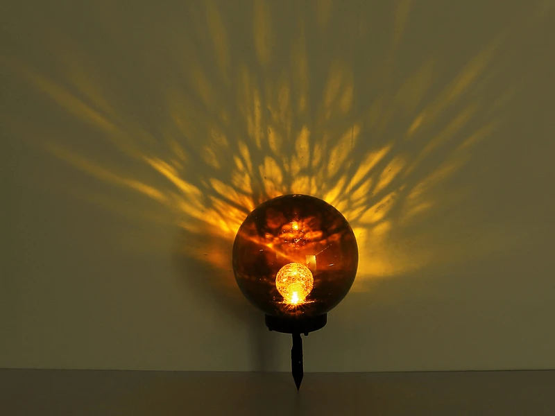 Diese ausgefallene Solarkugeln bestehen jeweils aus einer amberfarbigen Glaskugel, die von einer rauchfarbigen Kugel aus Kunststoff umhüllt ist.