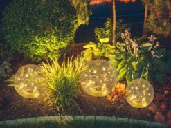 Die Leuchtkugeln verfĂŒgen jeweils ĂŒber ein Solarpanel das sich praktischerweise verdeckt im Boden der Leuchten befindet und so optisch nicht störend wirkt. Der eingebaute Akku der Kugellampen sorgt nach voller Sonneneinstrahlung fĂŒr eine Leuchtdauer von bis zu sechs Stunden und versorgt zuverlĂ€ssig das fest verbaute LED Modul mit einer jeweiligen Leistung von 15 x 0,06 / 20 x 0,06 und 30 x 0,06 Watt. Mit diesen zeitlosen Gartenkugeln setzen sie tolle Lichtakzente ganz unabhĂ€ngig vom Stromnetz im Garten und auf dem GrundstĂŒck.