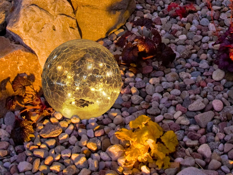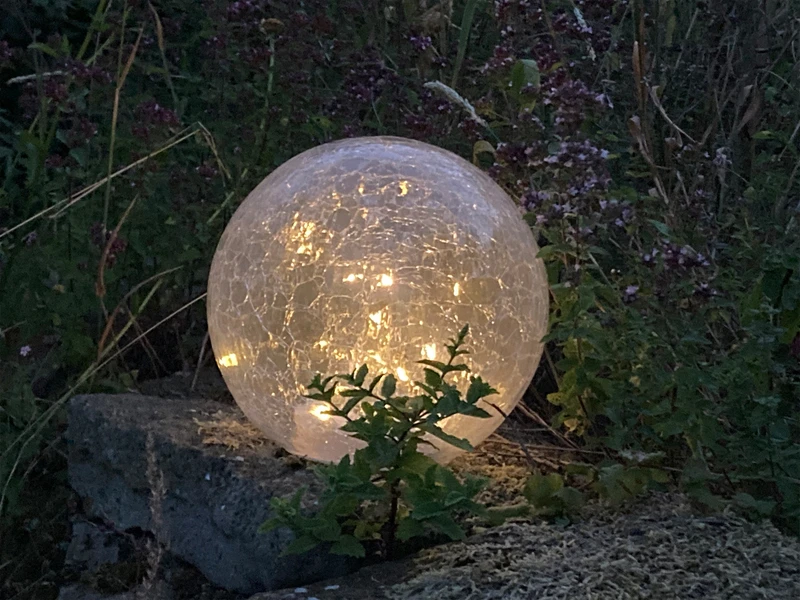 Diese ausgefallenen Solarkugeln sorgen mit den vielen kleinen LĂ€mpchen und dem Glasschirm in Bruchoptik fĂŒr faszinierende Lichtstpiele in Ihrem AuĂenbereich.