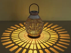 Die 37,5 cm großen Solarleuchten verfügen jeweils über ein Metallhenkel, welches es erlaubt, sie sowohl in stehender als auch in hängender Position (z.B. an Baumästen aufgehängt) zu bewundern. Diese ausgefallenen Korblampen im Boho Style werden von oben mit dem LED-Leuchtmittel beleuchtet, wodurch ein wunderschönes Muster projiziert wird. Das angenehm warmweiße Licht (3000 Kelvin) des fest verbauten LED-Leuchtmittels sorgt zusätzlich für eine stimmungsvolle Atmosphäre in Ihrem Garten, auf der Terrasse oder dem Balkon.