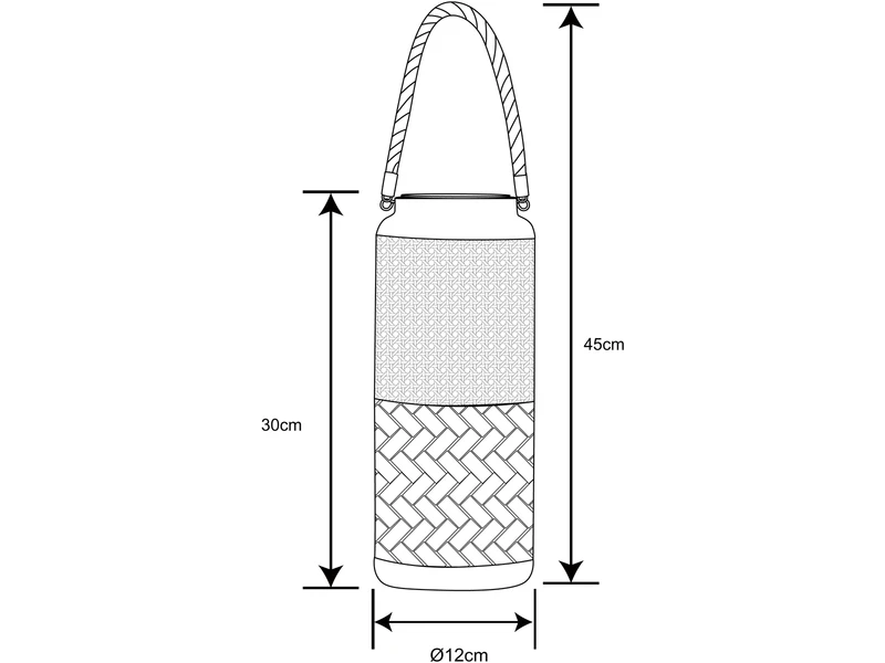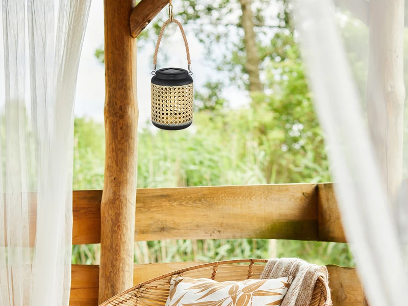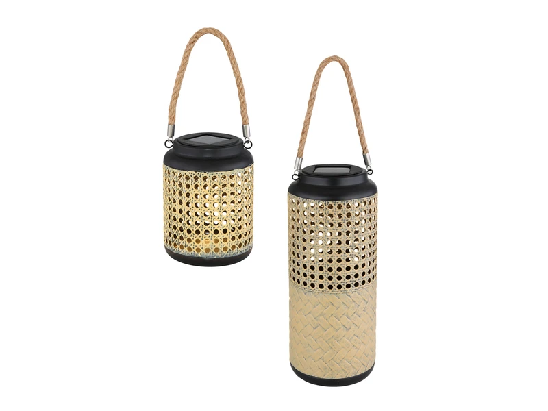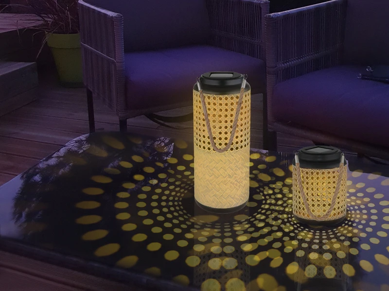 Die zylinderförmigen Solarleuchten verfĂŒgen jeweils ĂŒber ein Bambusseil, welches es erlaubt, sie sowohl in hĂ€ngender als auch in stehender Position (z.B. auf Tischen) zu bewundern. Die zahlreichen Kreise im Metall werden von oben mit dem LED-Leuchtmittel beleuchtet, wodurch ein wunderschönes Muster projiziert wird. Das angenehm warmweiĂe Licht (3000 Kelvin) des fest verbauten LED-Leuchtmittels sorgt zusĂ€tzlich fĂŒr eine stimmungsvolle AtmosphĂ€re in Ihrem Garten, auf der Terrasse oder dem Balkon.