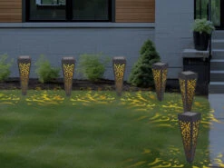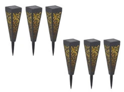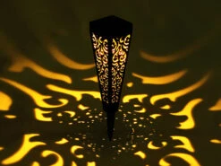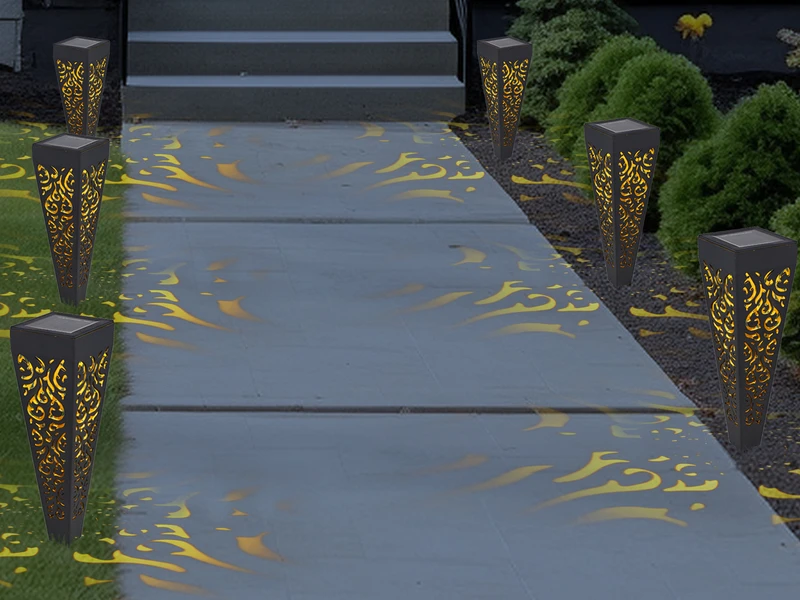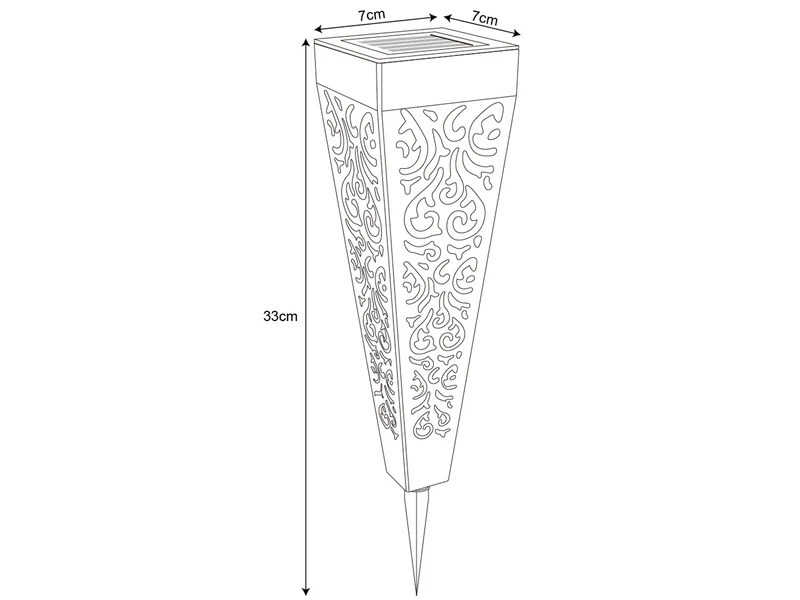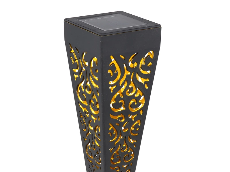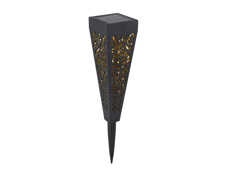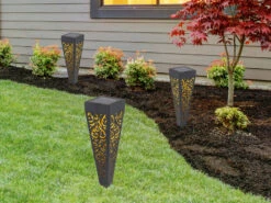 Wie kopfüber gestellte Pyramiden projizieren diese Erdspießleuchten durch den Dekorstanzungen elegante Muster auf den Boden und tauchen Ihren Garten in ein sanftes, goldenes Licht.