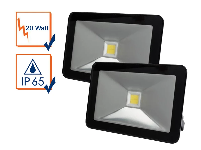 Gefertigt sind die Strahler aus robustem, schwarzem Aluminium. Mit ihrem schlanken Design nehmen sie auch an beengten Stellen wenig Platz ein. Die LED Scheinwerfer sind gerade einmal 3 cm dick und haben ein Außenmaß von 18 x 12,6 cm. Dennoch überzeugen sie mit einer starken Leistung von jeweils 20 Watt und 2050 Lumen in Neutralweiß.