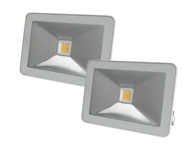 Gefertigt sind die Strahler aus robustem, weißem Aluminium Mit ihrem schlanken Design nehmen sie auch an beengten Stellen wenig Platz ein. Die LED Scheinwerfer sind gerade einmal 3,7 cm dick und haben ein Außenmaß von 21 x 14,7 cm. Dennoch überzeugen sie mit einer starken Leistung von jeweils 30 Watt und 2600 Lumen in Warmweiß.