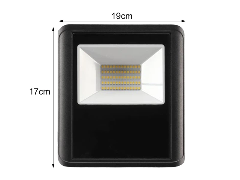 Gefertigt ist der Strahler aus robustem, schwarzem Aluminium. Der LED Scheinwerfer ist gerade einmal 5,6 cm dick und hat ein Außenmaß von 18,8 x 16,6cm. Dennoch überzeugt er mit einer starken Leistung von 50 Watt, 3500 Lumen & 4000 Kelvin in Neutralweiß.