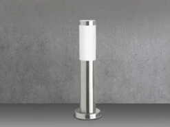 Gefertigt ist die Außenleuchte aus gebürstetem Edelstahl und weißem Kunststoff. Durch die matte Oberfläche wirkt sie dabei besonders elegant.