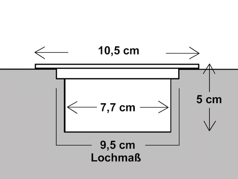 Der eckige Bodenspot hat eine Größe von: Oben 10,5cm x 10,5cm, Höhe 4,6cm, als Einbaumaß benötigen Sie einen Lochmaß von 9,5cm für den flachen Strahler.