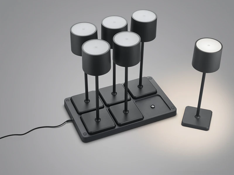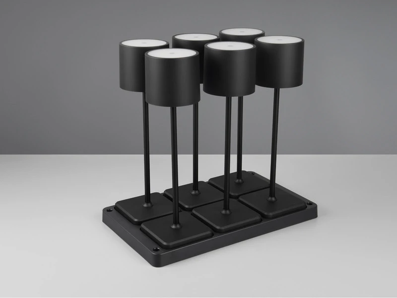 Das Set bestehend aus 6 Leuchten und einer zentralen Ladestation, auf der alle Tischlampen ohne lästigen Kabelsalat gleichzeitig geladen werden können, ist für den Einsatz in der Gastronomie perfekt geeignet und sorgt für schöne Beleuchtung auf Tischen im Restaurant oder Biergarten.