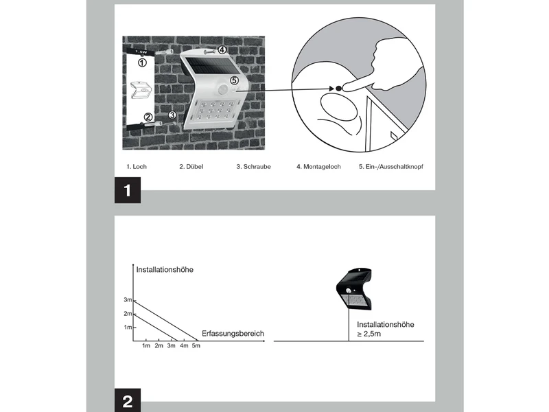 Sobald der integrierte Bewegungssensor bei Dunkelheit eine Bewegung im Radius von etwa 5 Metern erkennt, schaltet sich das fest verbaute 1,5 Watt LED Modul mit einer Leuchtkraft von 220 Lumen und 4000 Kelvin ein.