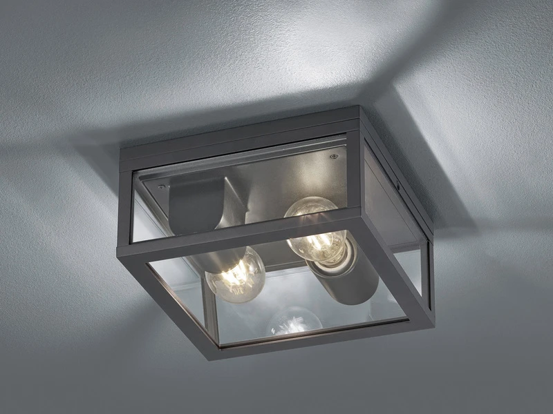 Die Deckenlampe hat eine Höhe von 11,5cm und eine Größe von 24 x 24cm. Mit einer Schutzart von IP44 kann sie in fast jedem Outdoor Bereich zur Fassadenbeleuchtung eingesetzt werden, z.B. als Außenbeleuchtung für Ihren Eingangsbereich, als Terrassenbeleuchtung oder auch auf dem Balkon.