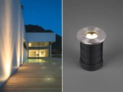 Die begehbaren Bodeneinbauleuchten aus dem Hause Trio Leuchten bestehen aus Edelstahl, und ist mit einem LED Leuchtmittel mit 3 Watt und 180 Lumen in warm weiß ausgestattet.