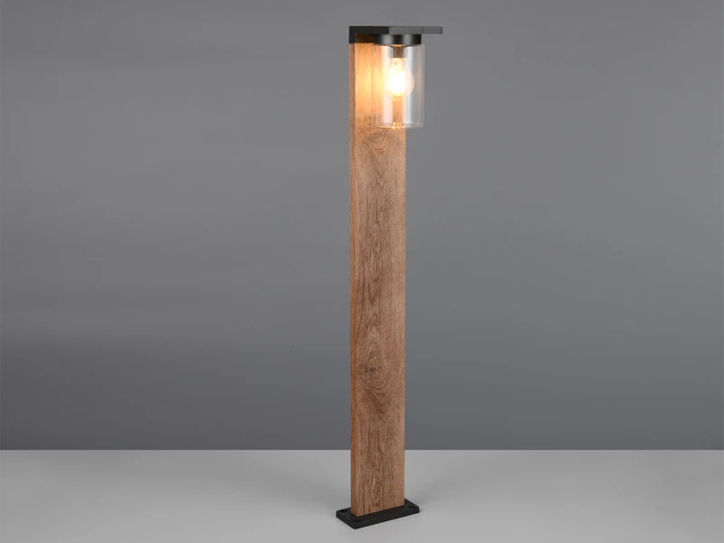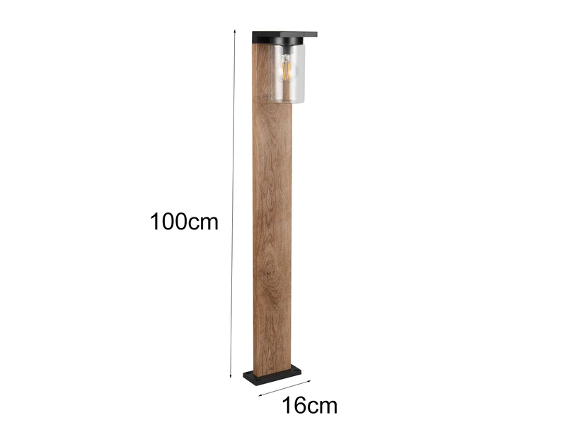 Mit ihrem besonderen Design mit Holzoptik und dem Lampenschirm aus klarem Glas, der fĂŒr die typische Laternenoptik sorgt, entsteht als Wegeleuchte eine angenehme AtmosphĂ€re und stimmungsvolle Lichtakzente rund um Ihr Haus.