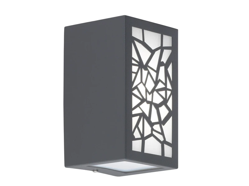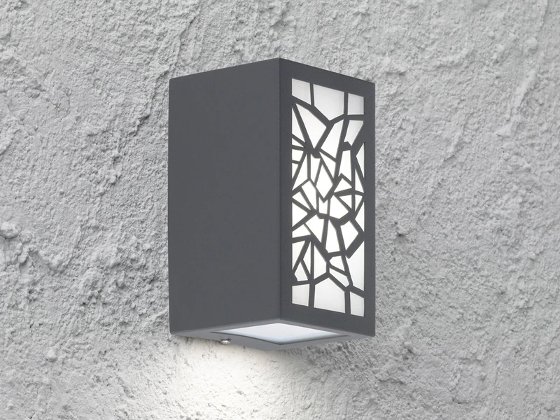 Der weiße Kunststoffkörper ist von einem Aluminiumgehäuse mit raffiniertem Muster umgeben, dies sorgt für ein elegantes Erscheinungsbild und setzt tolle Lichtakzente. Durch die zeitlose Form passt die Wandleuchte zu vielen Hausfassade und ergänzt das Gesamtbild harmonisch.
